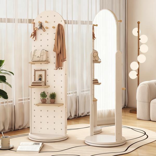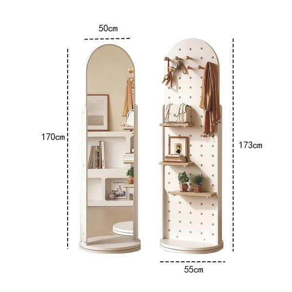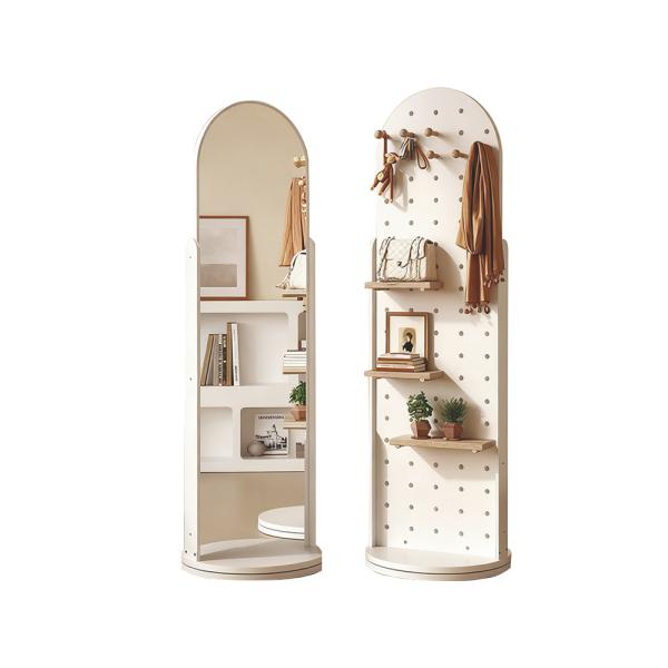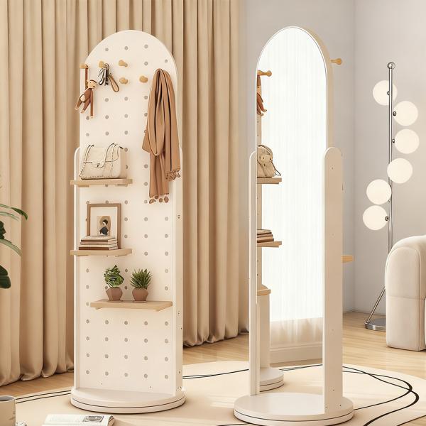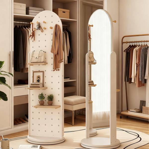 Multifunktional & praktisch: Kombination aus Ganzkörperspiegel, Ablage und Haken, zusätzlich mit Lochplatte ausgestattet – ideal zum Aufhängen und Abstellen von Kleidung, Accessoires u.v.m., alles griffbereit. Dank zweiseitigem Design ist der Schrank 360° drehbar und lässt sich mühelos zwischen Spiegel- und Garderobenfunktion wechseln. Der zweilagige Drehsockel sorgt für sanfte Rotation, ohne Platzierungsbeschränkung – praktisch und flexibel im Alltag.