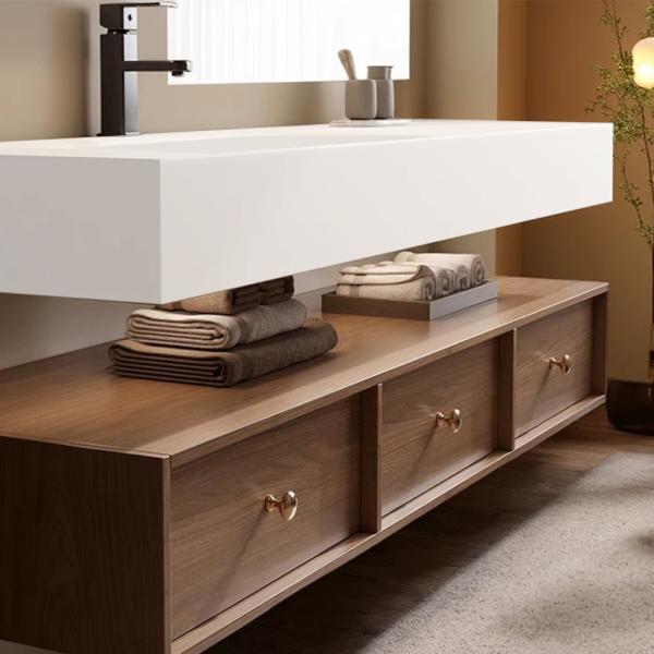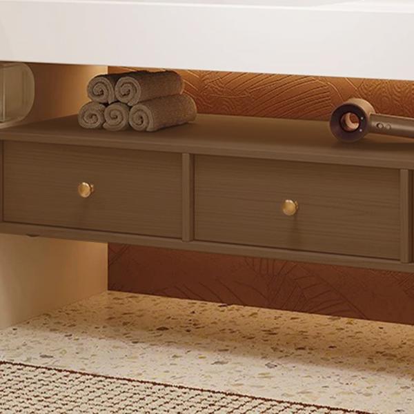 Das Zusammenspiel von weißem Becken und braunem Schrank schafft einen warmen, eleganten Kontrast und verleiht dem Raum eine natürliche Harmonie.