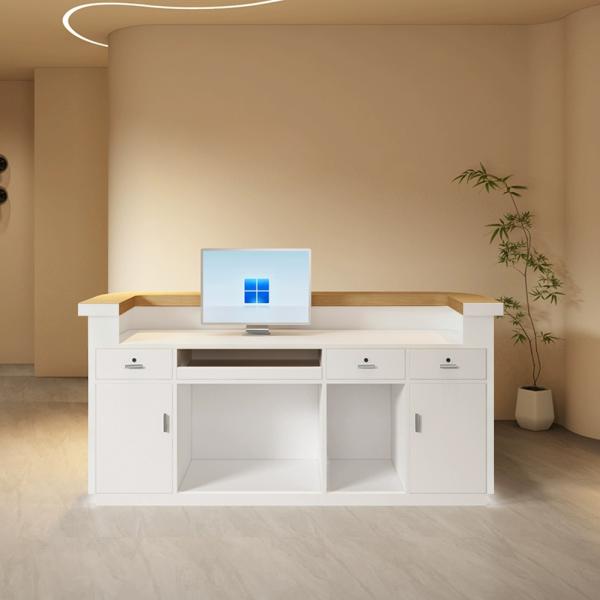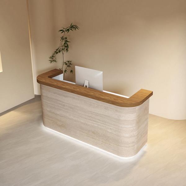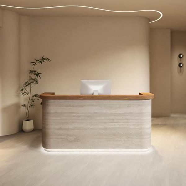 Diese Empfangstheke kombiniert die Praktikabilität von MDF mit einem modernen, klaren Design. Die Oberfläche zeigt fließende Linien, während abgerundete Kanten und glatte Oberflächen den hochwertigen Eindruck unterstreichen. Ideal für Büros, Empfangsbereiche oder kommerzielle Räume – vermittelt sofort eine professionelle und einladende Atmosphäre.