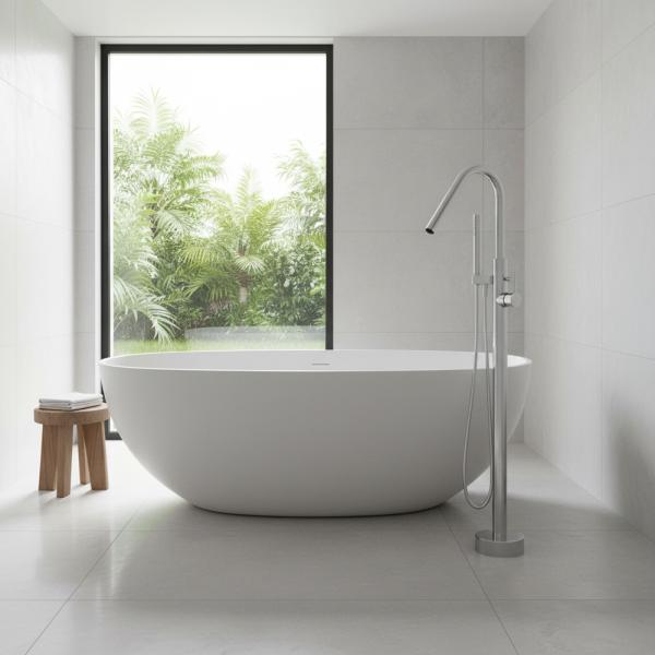 Diese freistehende Standarmatur überzeugt durch ihr elegantes, minimalistisches Design und hochwertige Verarbeitung. Sie wird direkt am Boden montiert, wodurch keine Wandinstallation erforderlich ist. Das macht sie besonders flexibel bei der Platzierung neben freistehenden Badewannen und in offenen Badezimmerkonzepten.