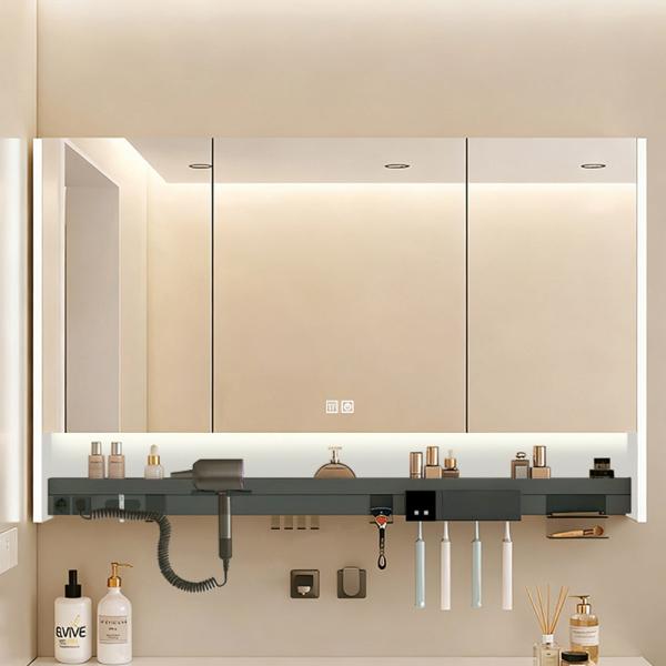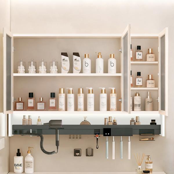 Unterhalb des Spiegels befindet sich ein praktisches Ablagefach, in dem Sie Föhn, Hautpflegeprodukte, Zahnpflegeartikel und andere Badutensilien übersichtlich und kategorisiert aufbewahren können. Integrierte Zahnbürstenhalter und Haken ermöglichen eine ordentliche und platzsparende Aufbewahrung.