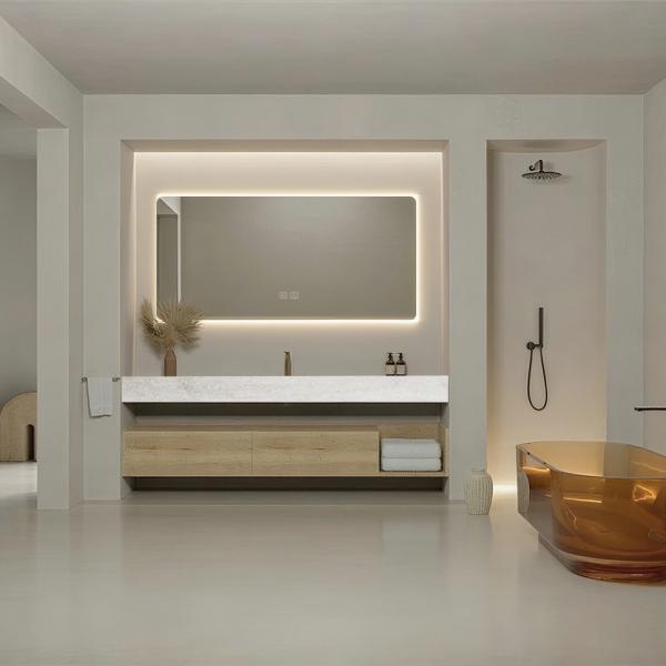 Der quadratische LED-Spiegel verfügt über eine Hintergrundbeleuchtung und eine integrierte Anti-Beschlag-Funktion, sodass das Spiegelbild selbst nach dem Duschen klar bleibt. Das sanfte, blendfreie LED-Licht sorgt für gleichmäßige Ausleuchtung, erleichtert präzise Tätigkeiten wie Schminken oder Rasieren und schafft gleichzeitig eine gemütliche Atmosphäre im Badezimmer.