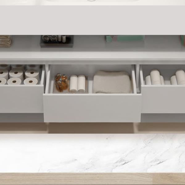 Die Schubladen eignen sich ideal zur Aufbewahrung kleiner oder privater Utensilien, um Unordnung zu vermeiden, während das offene Ablagefach Platz für Handtücher oder andere Alltagsgegenstände bietet – alles übersichtlich und leicht zugänglich.