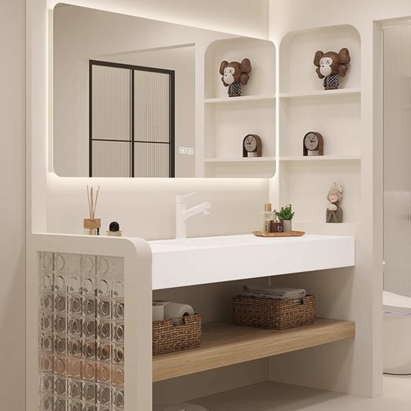 Das Set verfügt über ein integriertes Stauraumregal, das Platz für Handtücher, Pflegeprodukte oder Dekoration bietet.
