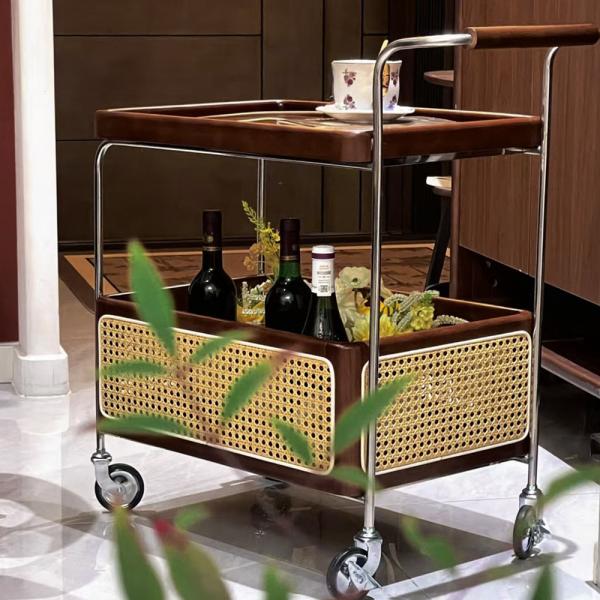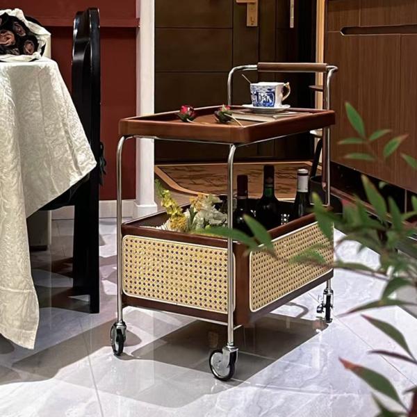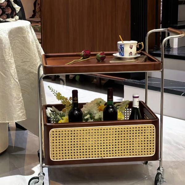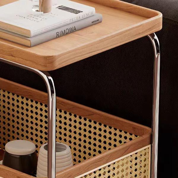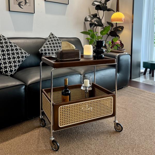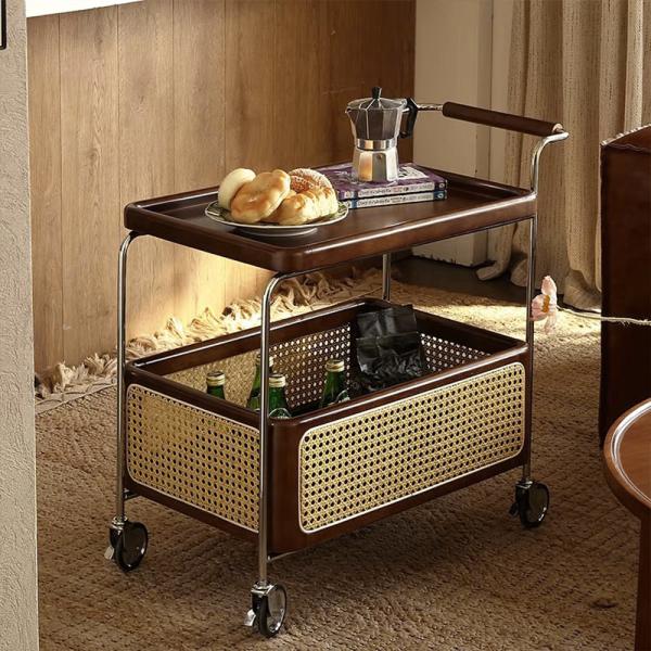 Die obere Ablage mit Tablettstruktur eignet sich ideal für Kaffeezubehör, Snacks oder Getränke. Der untere Rattankorb bietet zusätzlichen Stauraum für Flaschen, Magazine oder andere Gegenstände – perfekt für Küche, Esszimmer oder Wohnzimmer. Alles bleibt ordentlich und griffbereit.