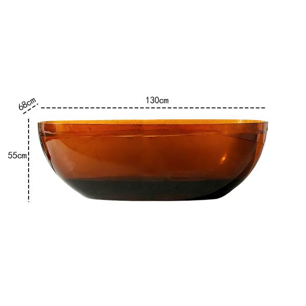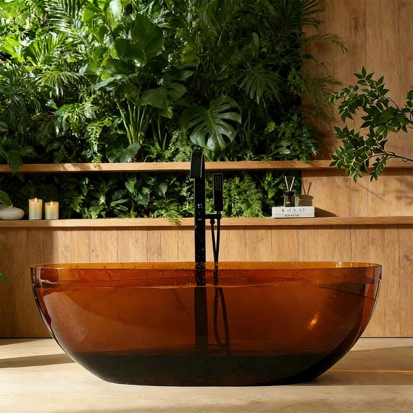 Der transparente, karamellfarbene Farbverlauf kombiniert mit hochwertigem Harzmaterial erzeugt einen Glanz wie „flüssiger Edelstein“. Diese Badewanne ist nicht nur ein Gebrauchsgegenstand, sondern auch ein ästhetisches Kunststück im Badezimmer. Unter Licht oder natürlichem Tageslicht entsteht eine luxuriöse, atmosphärische Raumwirkung.
