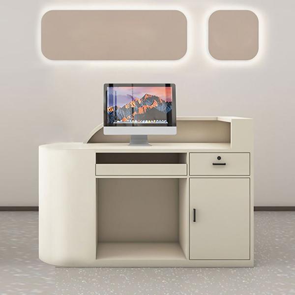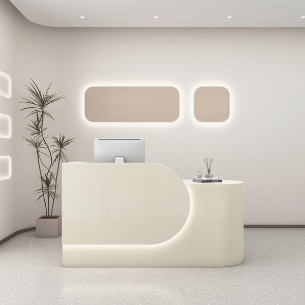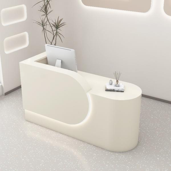 Cremeweißer Grundton kombiniert mit sanften Rundungen – fügt sich nahtlos in verschiedenste Einrichtungsstile ein. Der Tresen wirkt modern, weich und hochwertig, ohne im Raum zu dominieren.