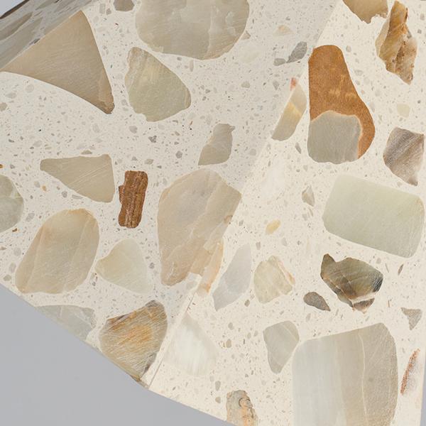 Gefertigt aus einem speziellen Material mit natürlicher Steinstruktur. Die Oberfläche fühlt sich fein und edel an und verleiht dem Raum eine rustikale, zugleich elegante Note – ein stilvoller Unterschied zu herkömmlichen Lampenschirmen mit hoher Wiedererkennbarkeit.