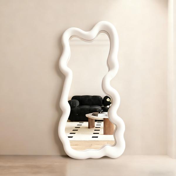 Die Kombination aus schlichtem Weiß und unregelmäßiger Form fügt sich harmonisch in verschiedene Einrichtungsstile ein – ob nordisch frisch, minimalistisch klar oder dezent luxuriös – der Spiegel veredelt jedes Raumkonzept.